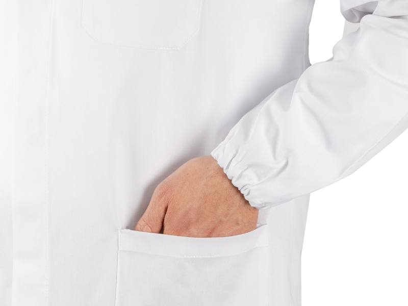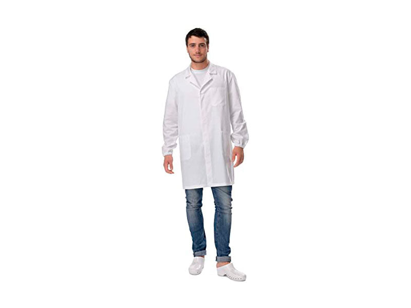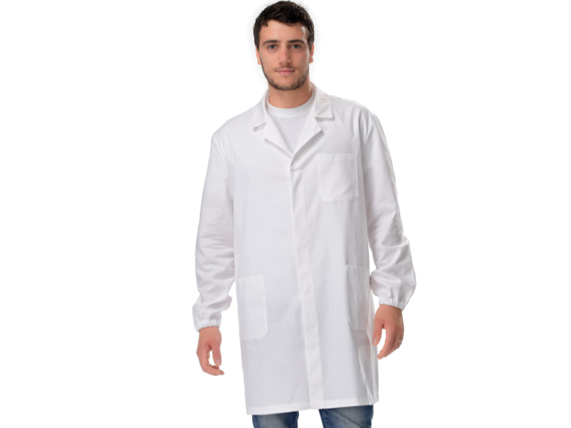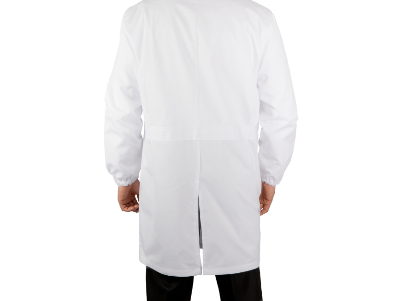 Camice da Laboratorio, bianco, in puro Gabardin cotone 100%, martingala cucito dietro, abbottonatura nascosta per una maggiore durata dei bottoni, polso con elastico come da norma di sicurezza, protegge meglio dall'entrata di eventuali liquidi, da pulvisco ed è anti impigliamento.